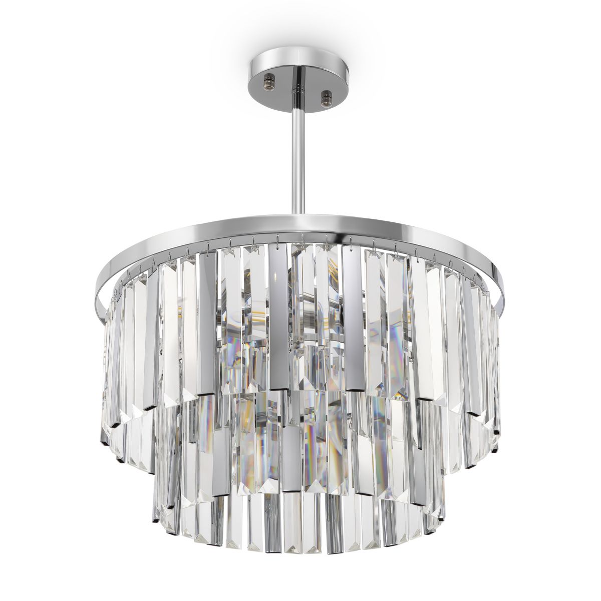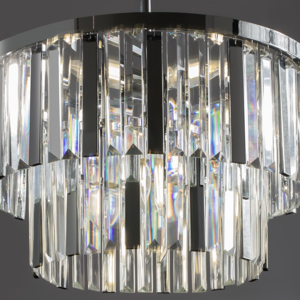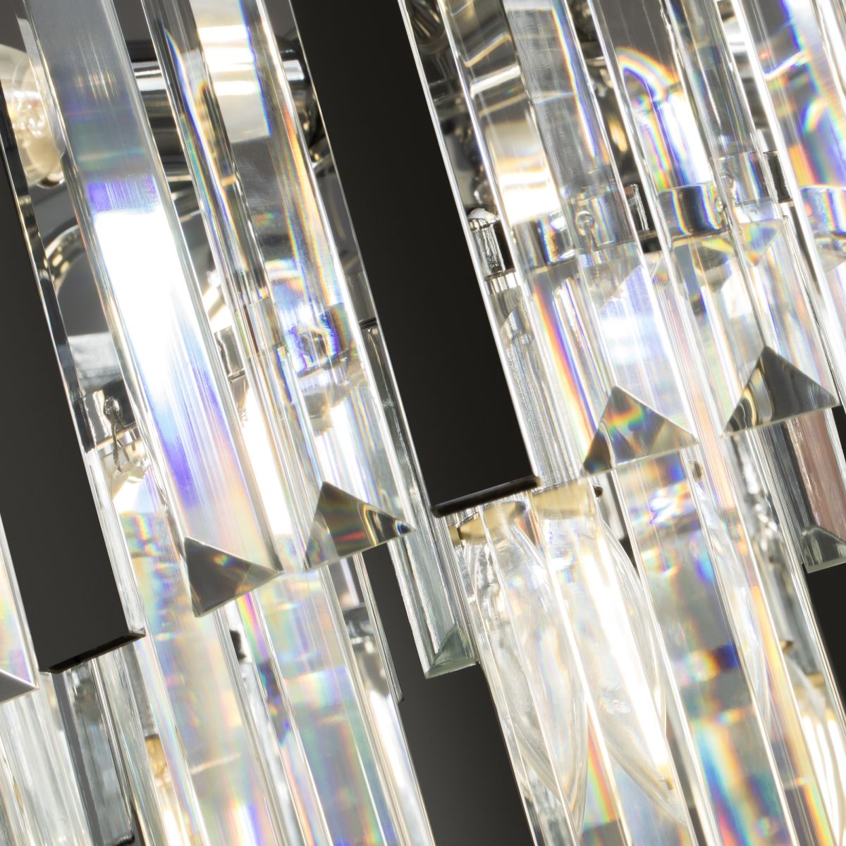 Арматура из металла. Оттенки – хром, золото. Многоярусный стеклянный декор прямоугольной вытянутой формы. В качестве источников света используются лампы с цоколем Е14.