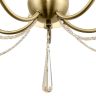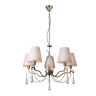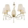Металлическая арматура. Цвет – латунь. Абажуры из фактурной ткани белого цвета. Декор – хрустальные подвесы каплевидной формы. Одиночный подвес и торшер с цоколем Е27, лампа, бра и люстры – Е14.