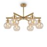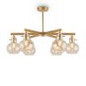 Металлическая арматура в золотом цвете. Стеклянные плафоны трендовой обтекаемой формы. Оттенок плафонов – шампань. Геометричный дизайн. Источник света – лампа с цоколем E14.