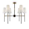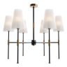 Материал арматуры – металл. Оттенки: хром, комбинация черного и латуни. Абажуры – белая ткань. Акцентный вытянутый силуэт. Источник света – лампа с цоколем E14.