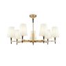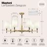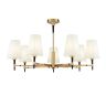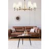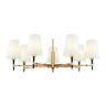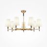 Металлическая арматура, гальванизация в цвет латуни. Часть элементов окрашена в черный цвет. Абажуры из белого текстиля, нанесенного на ПВХ. Источник света - лампа с цоколем Е14.