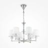 Материал арматуры – нержавеющая сталь, цвет – хром. Материал абажуров – текстиль на ПВХ, цвет – белый. Декор – прозрачное стекло. Акцентные стеклянные кристаллы на рожках со сложной огранкой.