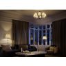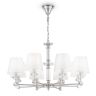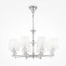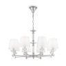Материал арматуры – нержавеющая сталь, цвет – хром. Материал абажуров – текстиль на ПВХ, цвет – белый. Декор – прозрачное стекло. Акцентные стеклянные кристаллы на рожках со сложной огранкой.