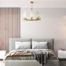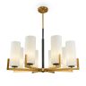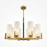 Арматура из металла, оттенок — латунь. Стеклянные плафоны в белом цвете. Часть элементов окрашена в контрастный черный оттенок. Геометрия в дизайне: цилиндрические плафоны, прямоугольные рожки.