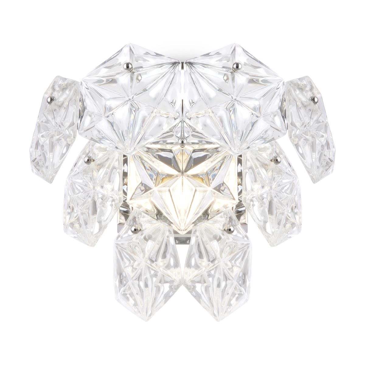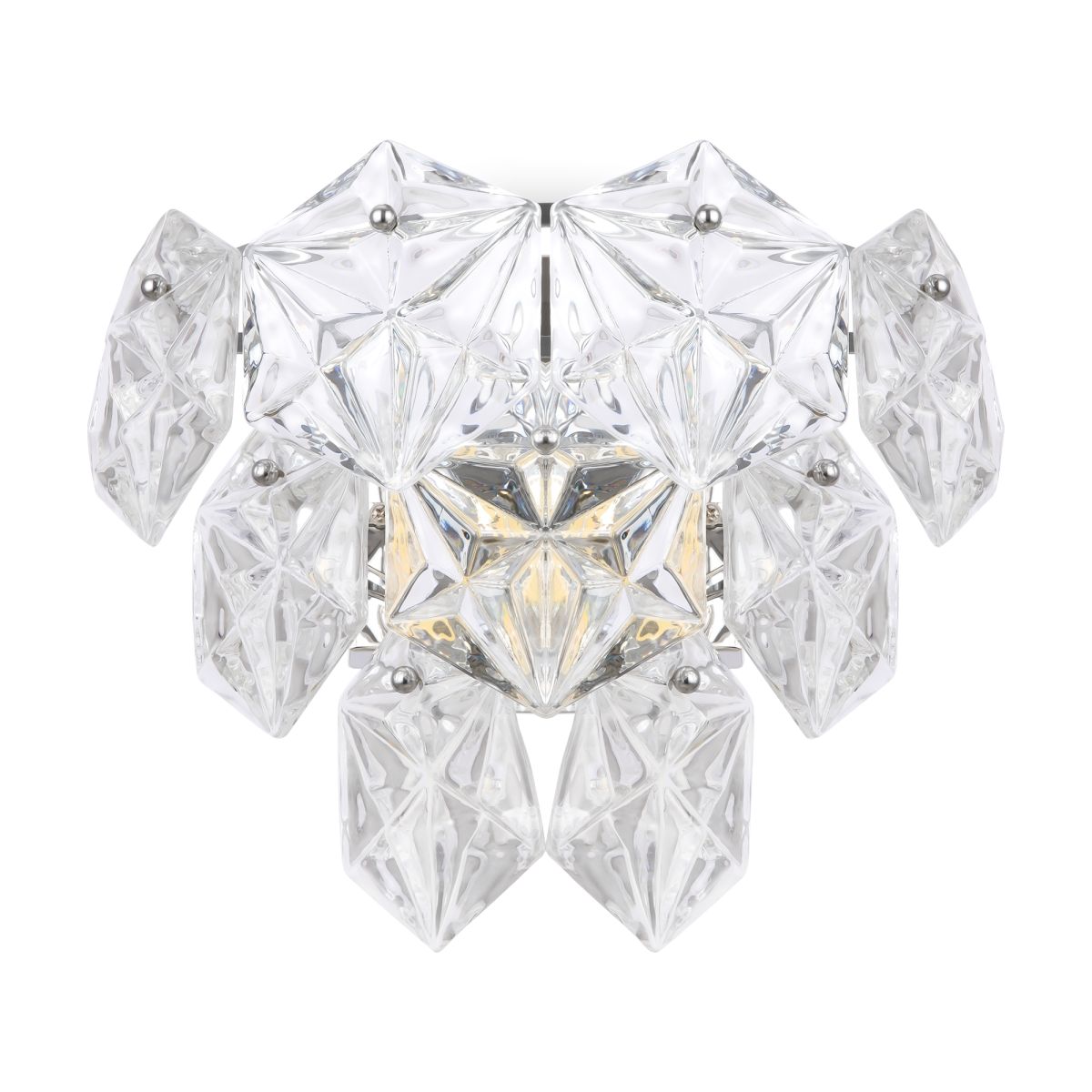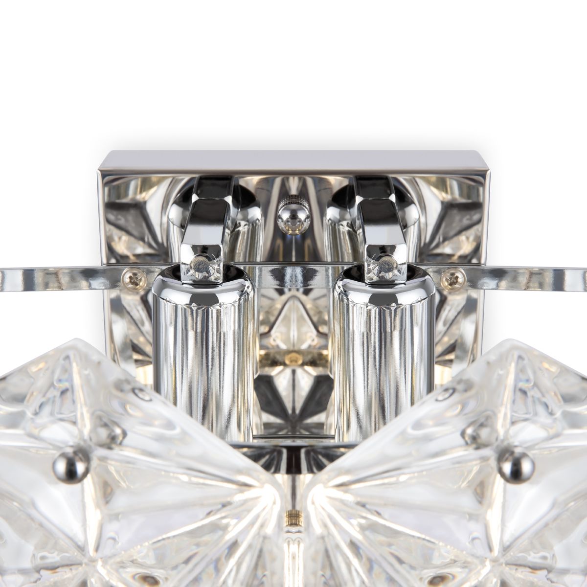 Хромированная металлическая арматура. Декор – прозрачное стекло в форме шестигранника. Крупные грани красиво преломляют свет. Регулируемая высота. Источник света – лампа с цоколем Е14.