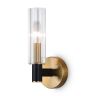 Арматура из металла сочетает два оттенка: черный и латунь. Плафоны цилиндрической формы выполнены из рельефного прозрачного стекла. Актуальная геометрия с настроением американской классики. Источник света – лампа с цоколем E14.
