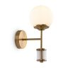 Металлическая арматура окрашена в цвет латуни. Плафоны-сферы из матового белого стекла. Декор – прозрачное рельефное стекло. Источник света – лампа с цоколем Е27.