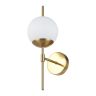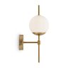 Арматура из металла. Цвет – латунь. Плафоны – матовое белое стекло. Трендовая геометрия в дизайне: арматура «пронизывает» плафоны-сферы. Источник света – лампа с цоколем Е27.