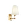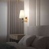 Металлическая арматура, гальванизация в цвет латуни. Часть элементов окрашена в черный цвет. Абажуры из белого текстиля, нанесенного на ПВХ. Источник света - лампа с цоколем Е14.