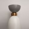 Арматура из металла, оттенки – латунь, белый. Металлические плафоны в двух цветовых решениях: белый + серый, голубой + бирюзовый. Оригинальная форма колокольчика. Поворотный механизм в плафонах для направленной подсветки.