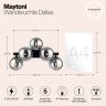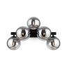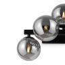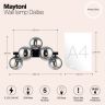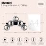 Металлическая арматура в четырех цветах: матовый черный, хром, золото, латунь. Плафоны — выдувное стекло. Цвета — дымчатый, янтарный, коньячный. Дизайн с имитацией молекулярной структуры. Высота подвесных светильников регулируется тросом. Лампа с цоколем G9.