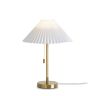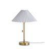 Материал арматуры — металл и дерево, цвет металла— латунь. Настольный, подвесной светильник и торшер с цоколем E27. Белый тканевый абажур гофрированный рельеф. Переключатель на настольной лампе и торшере на цепочке. Подходят для классических и современных интерьеров.