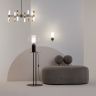 Металлическая арматура, цвет - черный. Светильники стилизованы под форму песочных часов с обтекаемой формой. Керамические элементы с глянцеовй глазурью. Подвесные светильники с плафонами из белой керамики с прозрачным, черно-белым, золото-белым и белым стеклом. Регулируемая высота подвесных светильников.