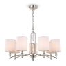 Материал арматуры – нержавеющая сталь, цвет – хром. Материал абажуров – текстиль на ПВХ, цвет – белый. Декор – прозрачное стекло. Акцентные стеклянные кристаллы на рожках со сложной огранкой.