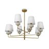 Металлическая арматура, цвет - латунь. Керамические декоративные элементы. Матовые белые абажуры. Силуэт светильника вытягивает интерьер. Источник света — лампа. Цоколь E14.
