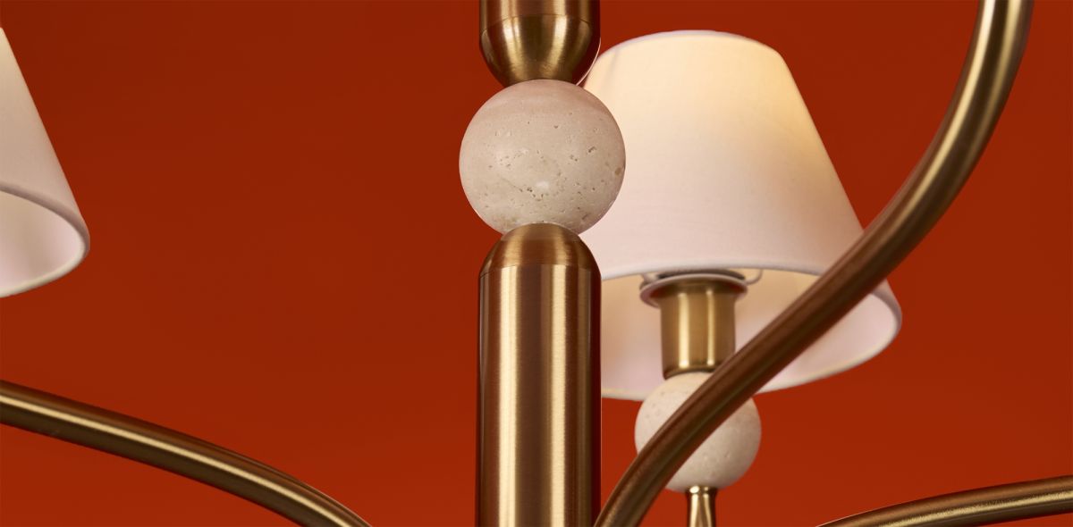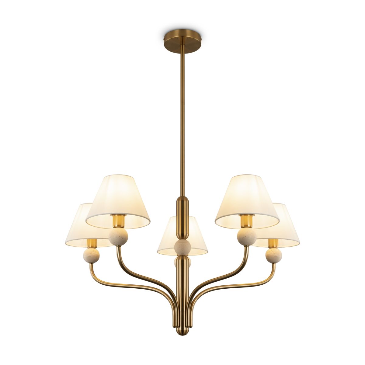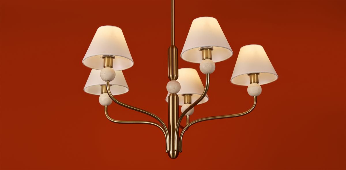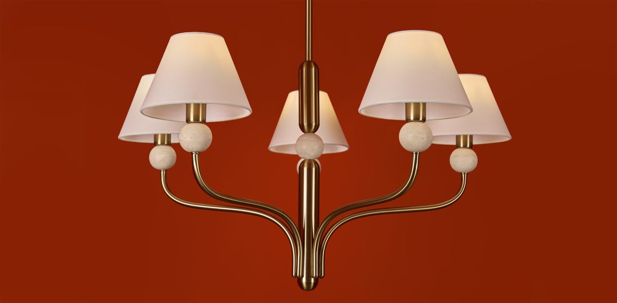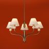 Арматура - металл в цвете латунь. Тканевые абажуры, травертиновые элементы. Лампы E14 (в комплекте). Серия состоит из люстры c 5 плафонами и бра. Трендовое сочетание в классическом стиле.