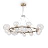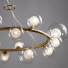 Металлическая арматура оттенка матового золота. Двойные стеклянные плафоны: матовые внутри и прозрачные снаружи. Плафоны закреплены на окружности, что обеспечивает равномерное освещение. Источник света – лампа с цоколем G9.