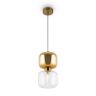 Металлическая арматура в двух оттенках: латунь, хром. Стеклянный плафон оригинальной формы. Верхняя часть плафона гальванизирована в тон арматуре, нижняя – прозрачная. Источник света – лампа G9.