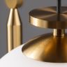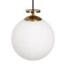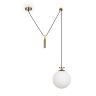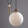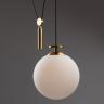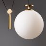 Чаша крепления и элементы корпуса выполнены из металла, цвета - черный и золотой. Плафон-сфера из белого матового стекла. Специальный грузик- противовес позволяет реглуировать высоту светильника. Универсальный дизайн для пространств любых габаритов. Источник света внутри плафона - лампа с цоколем Е27.
