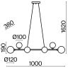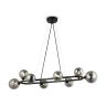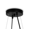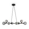 Металлическая арматура, цвета - черный и золотой. Плафоны-сферы из стекла 2х оттенков - матовый белый, полупрозрачный дымчатый - расположены на вытянутом металлическом каркасе, обеспечивая равномерный свет. Тонкие тросы придают светильнику эффект парения. Источник света - лампа с цоколем G9.