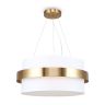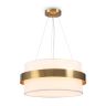 Цилиндрической формы абажур из ткани белого цвета. Декоративная парящая окантовка из металла в цвет арматуры. Регулируется по длине. Компактные размеры подходят для низких потолков и небольших интерьеров. Металлическая арматура, цвет - латунь и никель. Источник света — лампа с цоколем Е14, E27 и для настенного бра дополнительный LED с температурой свечения 3000 K.