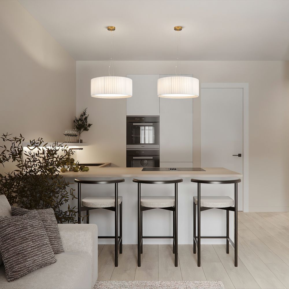 Металлическая арматура в цвете латунь. Подвесные светильники 2-х форм с плессированными абажурами, дополненные рассеивателем. Лампы E27/E14 (не в комплекте) дают мягкий рассеянный свет.