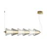 Арматура из металла. Цвет латунь. Плафон из матового, кристально прозрачного и дымчатого стекла. Горизонтальные и вертикальные подвесы. LED источник света. Цветовая температура 3000К.