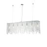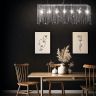 Арматура из металла в цвете хром. Декор – подвески из прозрачного хрусталя. Оригинальная прямоугольная форма. Высота светильников регулируется тросом.
