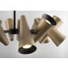 Металлическая арматура в двух оттенках: белый и черный. Плафоны-конусы выполнены из алюминия. Оттенки: белый, латунь. Рожки вращаются, можно менять направление света. Высота регулируется с помощью разборного центрального элемента.