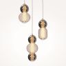 Материал арматуры - металл, цвета - золото, хром. Микс плафонов: гладкие cферы коньячного или дымчатого оттенка + округлые рельефные с ромбовидным узором из прозрачного стекла. Регулируемая высота подвесных моделей - максимальная длина провода 3 метра. LED-источник света, цветовая температура 3000К