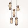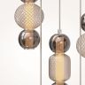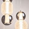 Материал арматуры - металл, цвета - золото, хром. Микс плафонов: гладкие cферы коньячного или дымчатого оттенка + округлые рельефные с ромбовидным узором из прозрачного стекла. Регулируемая высота подвесных моделей - максимальная длина провода 3 метра. LED-источник света, цветовая температура 3000К