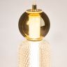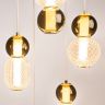 Материал арматуры - металл, цвета - золото, хром. Микс плафонов: гладкие cферы коньячного или дымчатого оттенка + округлые рельефные с ромбовидным узором из прозрачного стекла. Регулируемая высота подвесных моделей - максимальная длина провода 3 метра. LED-источник света, цветовая температура 3000К