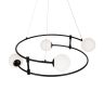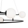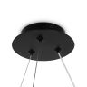 Арматура из металла в двух оттенках: черный и золото. Плафоны из матового выдувного стекла крепятся к металлическим дугам. Высота регулируется с помощью тросов.