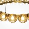 Металлическая арматура цвета латуни с сатинированным эффектом. Яркие небольшие плафоны диаметром 80 мм цвета янтаря. Встроенный LED источник света дает мощный световой поток с цветовой температурой 3000К и углом рассеивания 120 градусов. Подвесные светильники выполнены в виде перевернутой арки и в трендовой форме круга, расположение плафонов настенного светильника напоминает созвездие.