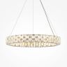 Металлическая арматура в двух вариантах цвета — хром или золото. Прозрачные декоративные элементы из хрустального стекла. Широкое кольцо снабжено LED-источником света. Цветовая температура потока излучения — 3000 К, угол рассеивания — 120 градусов. Регулируемый по высоте провод длиной 3 метра. Украшение шахматным рисунком.