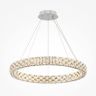 Металлическая арматура в двух вариантах цвета — хром или золото. Прозрачные декоративные элементы из хрустального стекла. Широкое кольцо снабжено LED-источником света. Цветовая температура потока излучения — 3000 К, угол рассеивания — 120 градусов. Регулируемый по высоте провод длиной 3 метра. Украшение шахматным рисунком.