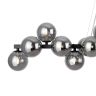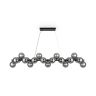 Металлическая арматура в четырех цветах: матовый черный, хром, золото, латунь. Плафоны — выдувное стекло. Цвета — дымчатый, янтарный, коньячный. Дизайн с имитацией молекулярной структуры. Высота подвесных светильников регулируется тросом. Лампа с цоколем G9.