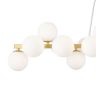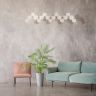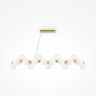 Металлическая арматура в четырех цветах: матовый черный, хром, золото, латунь. Плафоны — выдувное стекло. Цвета — дымчатый, янтарный, коньячный. Дизайн с имитацией молекулярной структуры. Высота подвесных светильников регулируется тросом. Лампа с цоколем G9.