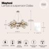 Металлическая арматура в четырех цветах: матовый черный, хром, золото, латунь. Плафоны — выдувное стекло. Цвета — дымчатый, янтарный, коньячный. Дизайн с имитацией молекулярной структуры. Высота подвесных светильников регулируется тросом. Лампа с цоколем G9.