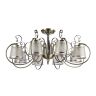 Абажуры и арматура светильников выполнены в разных цветах, с несколькими видами арматуры. Основание люстры украшено стеклянным декоративным элементом, а завитки рожков украшают подвески.