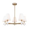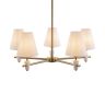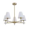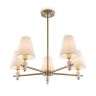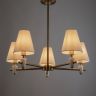 Металлическая арматура в цвете латунь. Дополнительные элементы — минималистичные вставки из натурального белого мрамора. Белые абажуры из ткани в форме конуса. Источник света — лампа с цоколем Е14 или Е27.