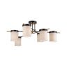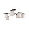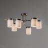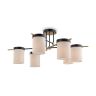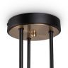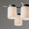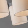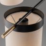 Арматура из металла. Основной цвет — чёрный, декоративные элементы в цвете латунь. Тканевые бежевые абажуры-цилиндры украшены чёрными металлическими основаниями. Компактные размеры для невысоких потолков. Источник света — лампа с цоколем Е14.