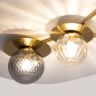 Компактное металлическое основание и арматура цвета латуни. Две модели с плафонами белого цвета и две с разноцветными плафонами: серый, прозрачный, дымчатый и оттенка коньяка. Источник света: цоколь Е14. Компактное основание светильника прилегает к потолку. Функциональное основное освещение. Местоположение разноцветных плафонов можно менять, создавая композиции по своему вкусу. Поверхность плафонов имеет орнамент, при включении светильника на потолке создаются узоры.